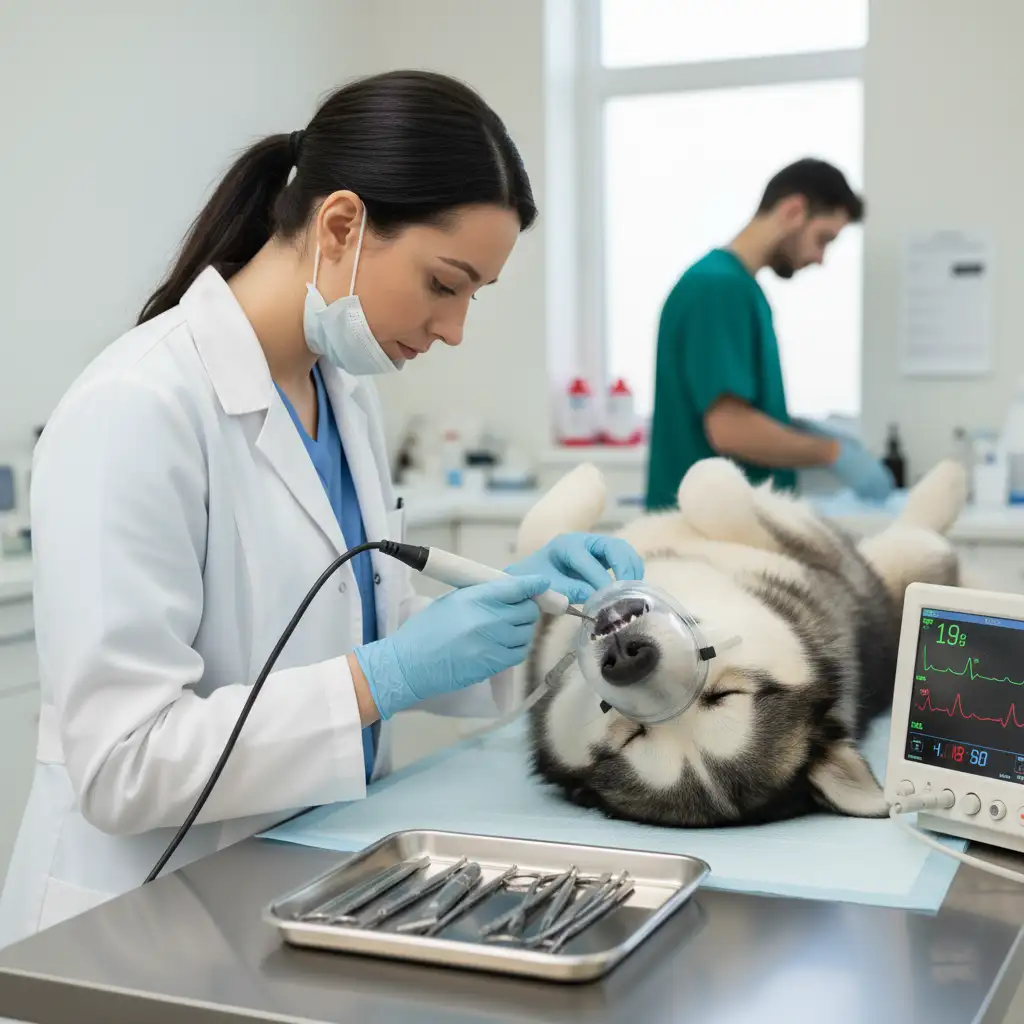 Процедура проводится под анестезией. Это важно — собака не испытывает боли и стресса. Используется специальное оборудование: щипцы, ультразвук, инструменты для работы с корнями.